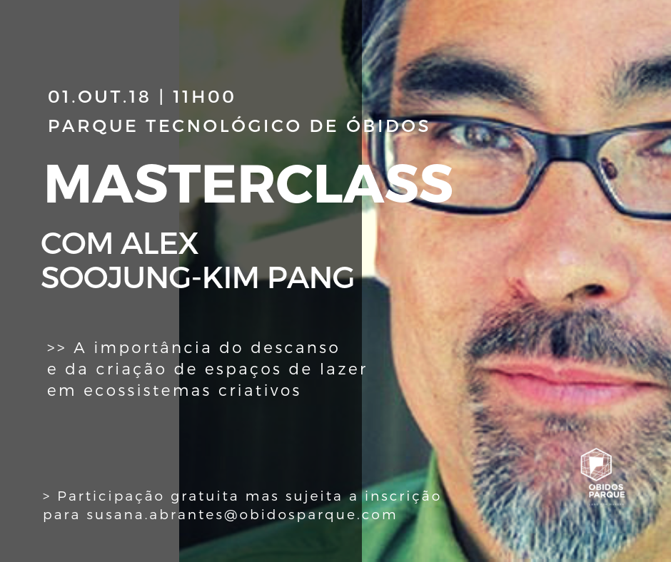 Segunda-feira, 01 de outubro, pelas 11h00, o Óbidos Parque recebe Alex Soojung-Kim Pang, escritor e consultor em Silicon Valley. Em Portugal por ocasião do FOLIO - Festival Literário Internacional de Óbidos, Alex Pang promove, exclusivamente para o parque tecnológico, uma masterclass sobre a importância do descanso e da criação/existência de espaços de lazer em ecossistemas criativos.