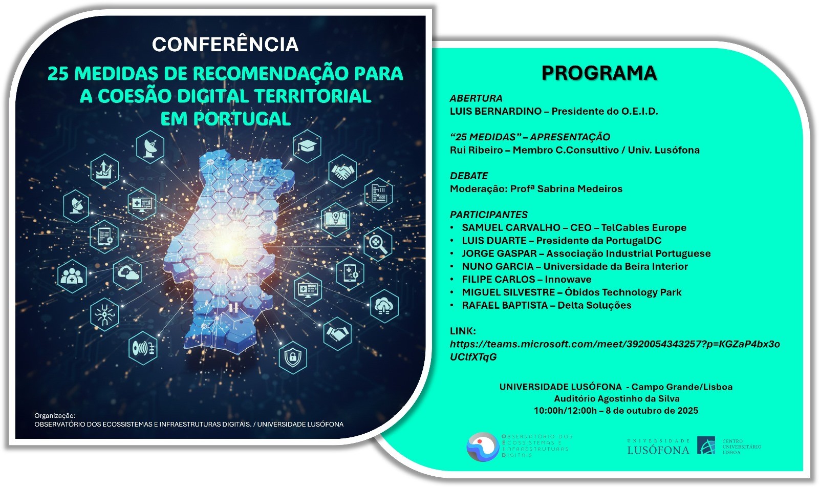 O diretor executivo do Parque Tecnológico de Óbidos, Miguel Silvestre, participou, esta terça-feira, 8 de Outubro, na conferência “25 Medidas de Recomendação para a Coesão Digital Territorial em Portugal”, promovida pelo Observatório dos Ecossistemas e Infraestruturas Digitais (OEID), em parceria com a Universidade Lusófona.